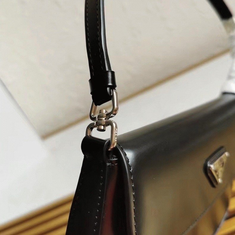 The Prada Cleo bag radiates refined elegance, revisiting a classic 1990s design with a fresh perspective. Its smooth, curved silhouette, characterized by rounded edges and a rounded base, gives the flap bag a light and graceful look. Made from brushed leathera contemporary and adaptable material closely associated with Pradathis piece invites countless styling opportunities through its blend of textures and contrasts. The iconic enamel triangle logo on the flap adds a distinguished and elegant finishing detail.