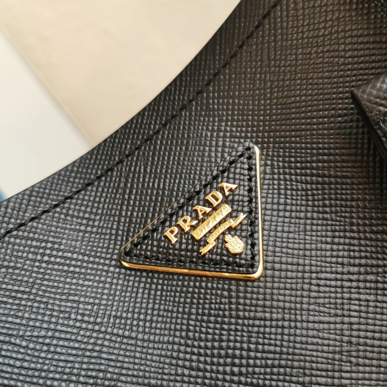Features a triangle logo on the Saffiano leather