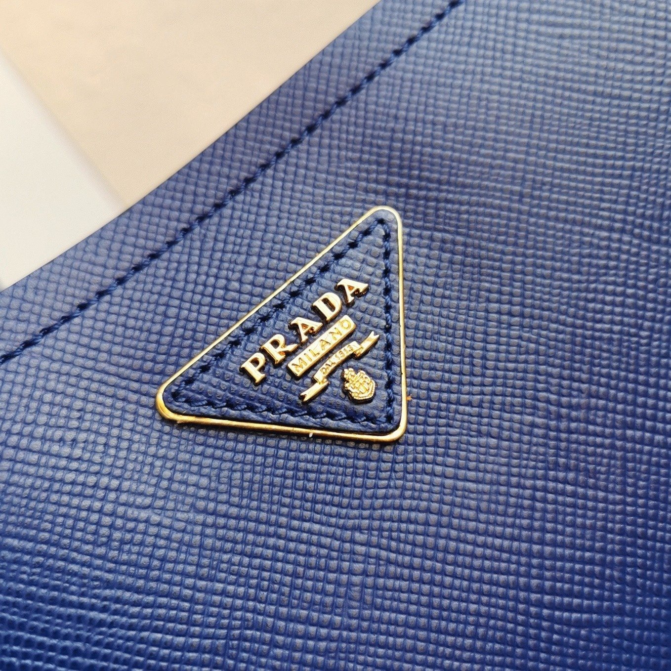 Features a triangle logo on the Saffiano leather