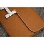 The Hermes Constance Wallet draws inspiration from the iconic Hermes Constance bag. This wallet is a smaller version of the bag, featuring the signature H logo and flap closure. It is designed slightly smaller and wider for added practicality, maintaining the distinct style of the Constance bag even without the strap. The wallet includes twelve credit card slots, two flat pockets, a central zipped coin purse, a front pocket, and a rear external pocket.