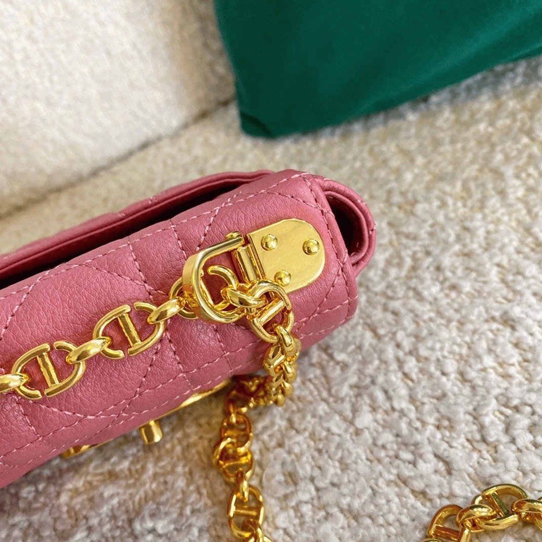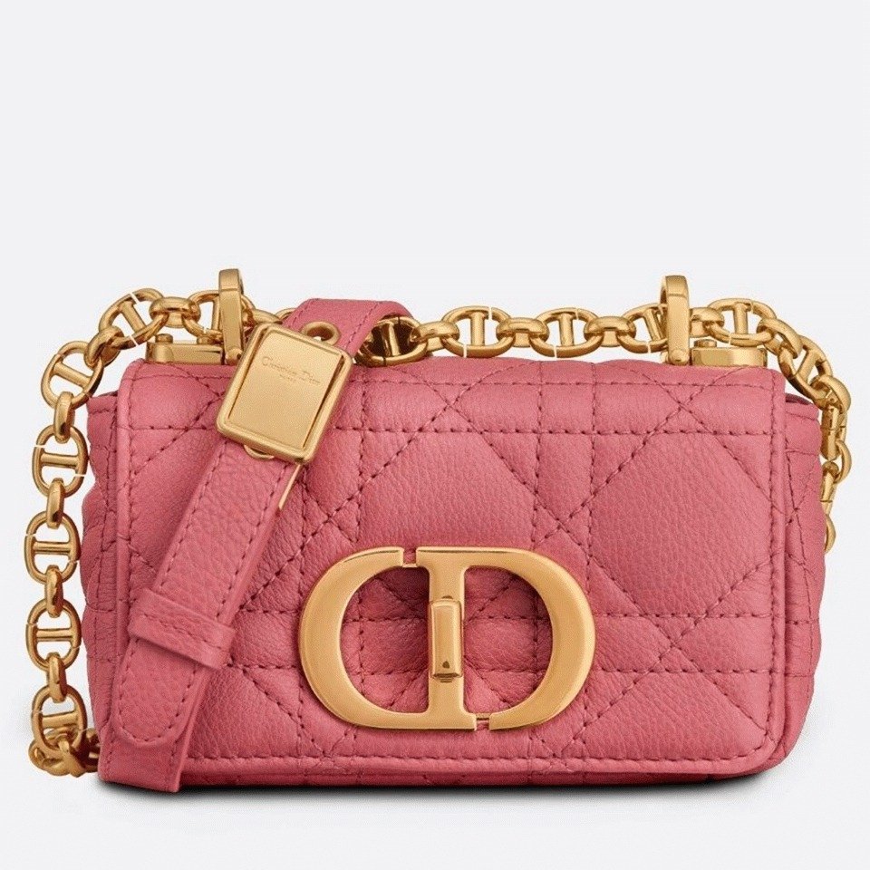 The Dior Caro bag perfectly merges modern design with timeless sophistication. Made from soft calfskin leather, it features the iconic Cannage stitching. The flap is secured by an antique gold-tone metal ‘CD’ twist clasp, inspired by the seal of Christian Dior perfume bottles. The detachable chain shoulder strap, decorated with ‘CD’ signature links, allows for multiple ways to carryby hand, on the shoulder, or crossbody. This strap can be replaced with one of Diors wide embroidered straps, offering versatility for both casual and formal occasions.