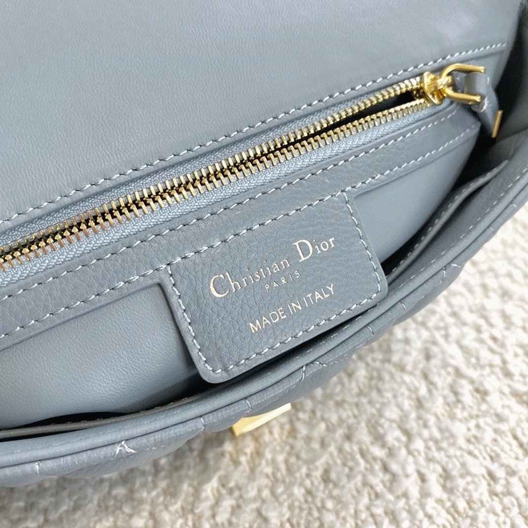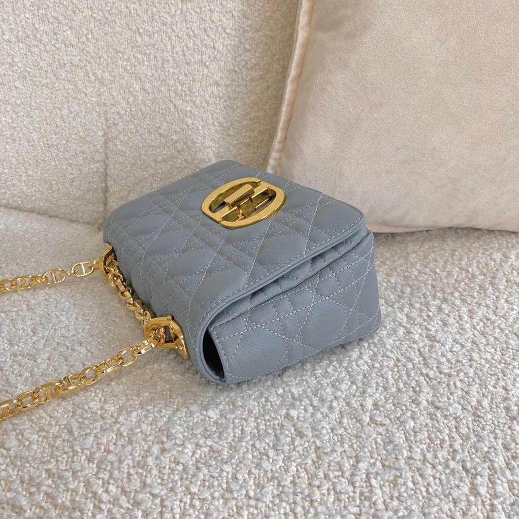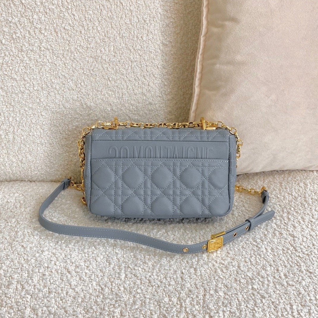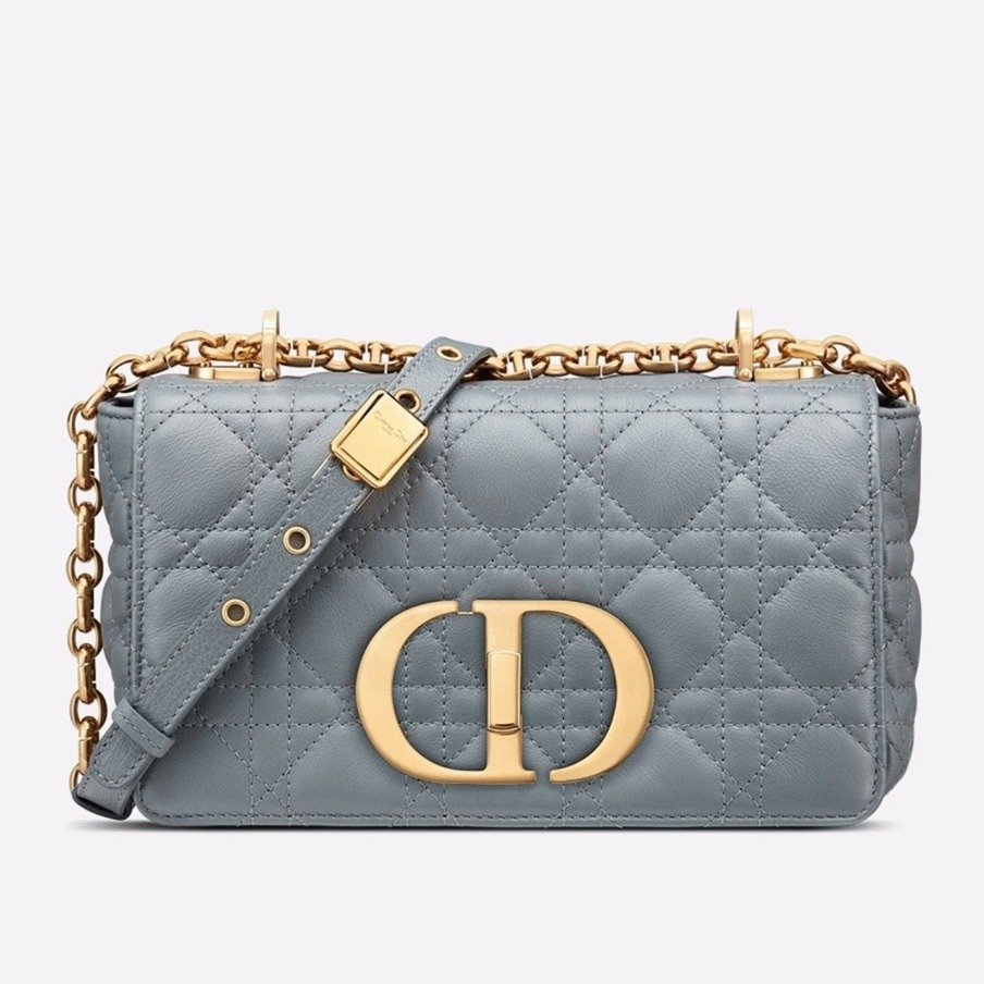 The Dior Caro bag seamlessly combines modern design with timeless elegance. Made from soft calfskin leather, it features the brands signature Cannage stitching. The flap is secured by an antique gold-tone metal ‘CD’ twist clasp, inspired by the seal on Christian Dior perfume bottles. The detachable chain shoulder strap, adorned with ‘CD’ signature links, allows for versatile wearby hand, over the shoulder, or crossbody. This chain can also be replaced with one of Diors wide embroidered straps, making the bag perfect for both day and night occasions.