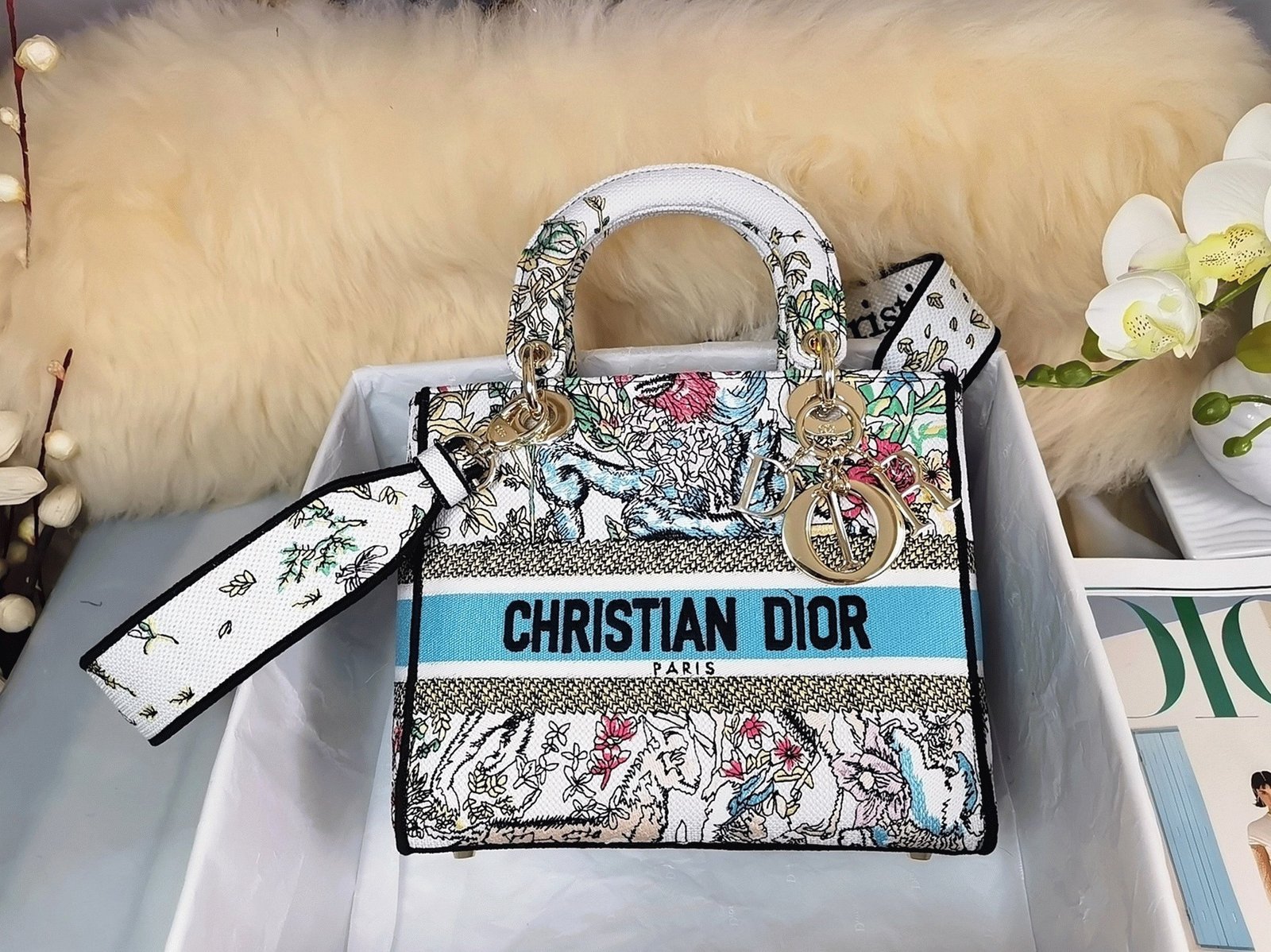 Designed for flexible styling, the medium Lady D-Lite includes a wide embroidered strap that is both removable and reversible, allowing for hand, shoulder, or crossbody carry. Inside, the bag features a zip pocket and a large patch pocket for practical organization. It can also be customized with other embroidered straps for a personalized look.