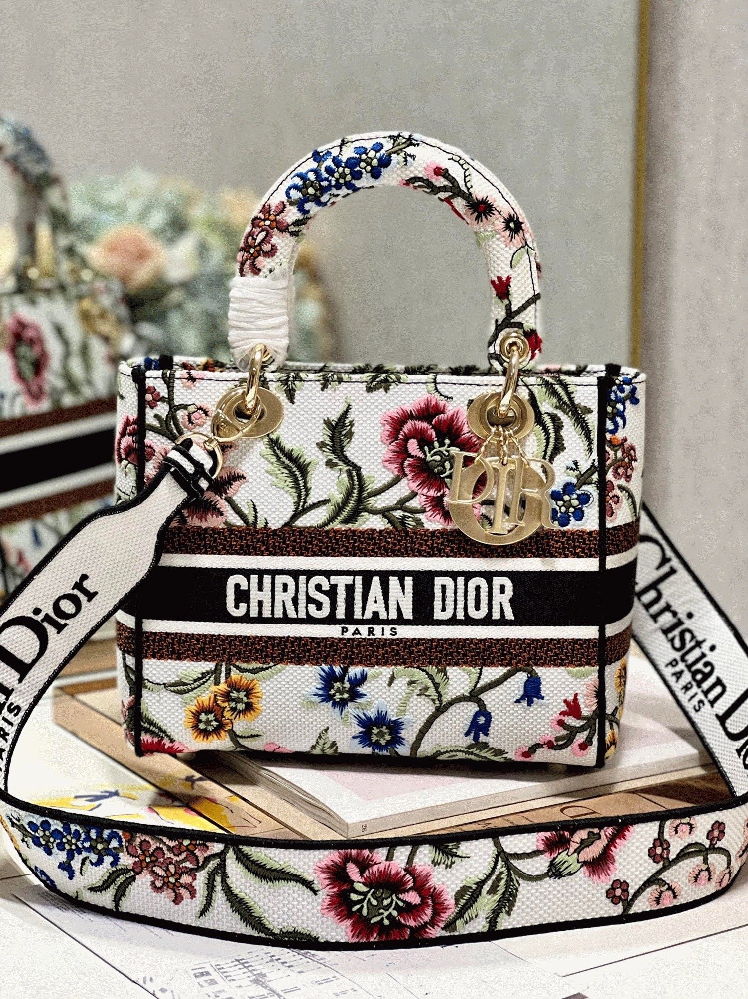 The Lady D-Lite bag merges classic style with a vibrant, modern spirit. This version is fully embroidered with the multicolor Dior Petites Fleurs motif, celebrating Diors floral heritage with color and elegance. The signature ‘CHRISTIAN DIOR PARIS’ is prominently featured on the front, with pale gold-finish ‘D.I.O.R.’ charms adding a touch of shine.