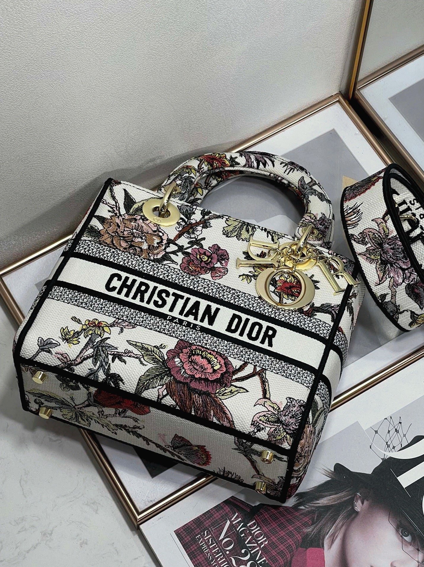 The Lady D-Lite bag harmonizes classic elegance with the contemporary touch of the House of Dior. It features the charming Dior Jardin Botanique motif, a romantic floral pattern inspired by the Granville gardens dear to Mr. Dior. The front proudly displays the CHRISTIAN DIOR PARIS signature, while pale gold-finish D.I.O.R. charms add a luxurious accent that enhances the silhouette.