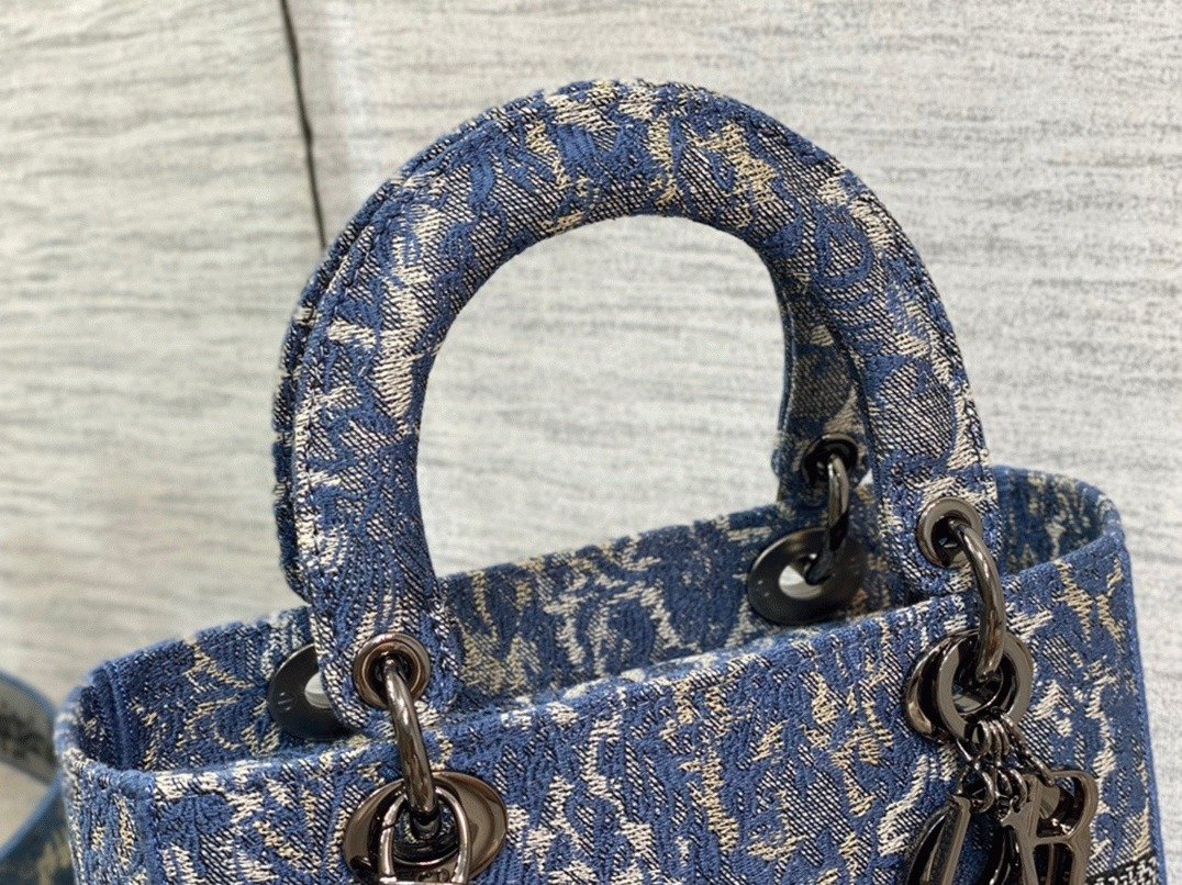 The Lady D-Lite bag blends timeless charm with modern style, featuring full embroidery in the blue Dior Brocart motif with a denim effect. This contemporary reinterpretation highlights Diors classic codes. The front displays the CHRISTIAN DIOR PARIS signature, while ruthenium-finish metal D.I.O.R. charms add an elegant accent.