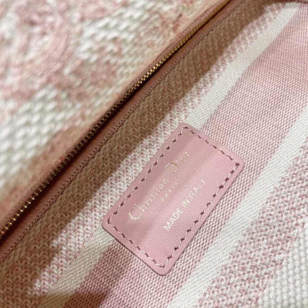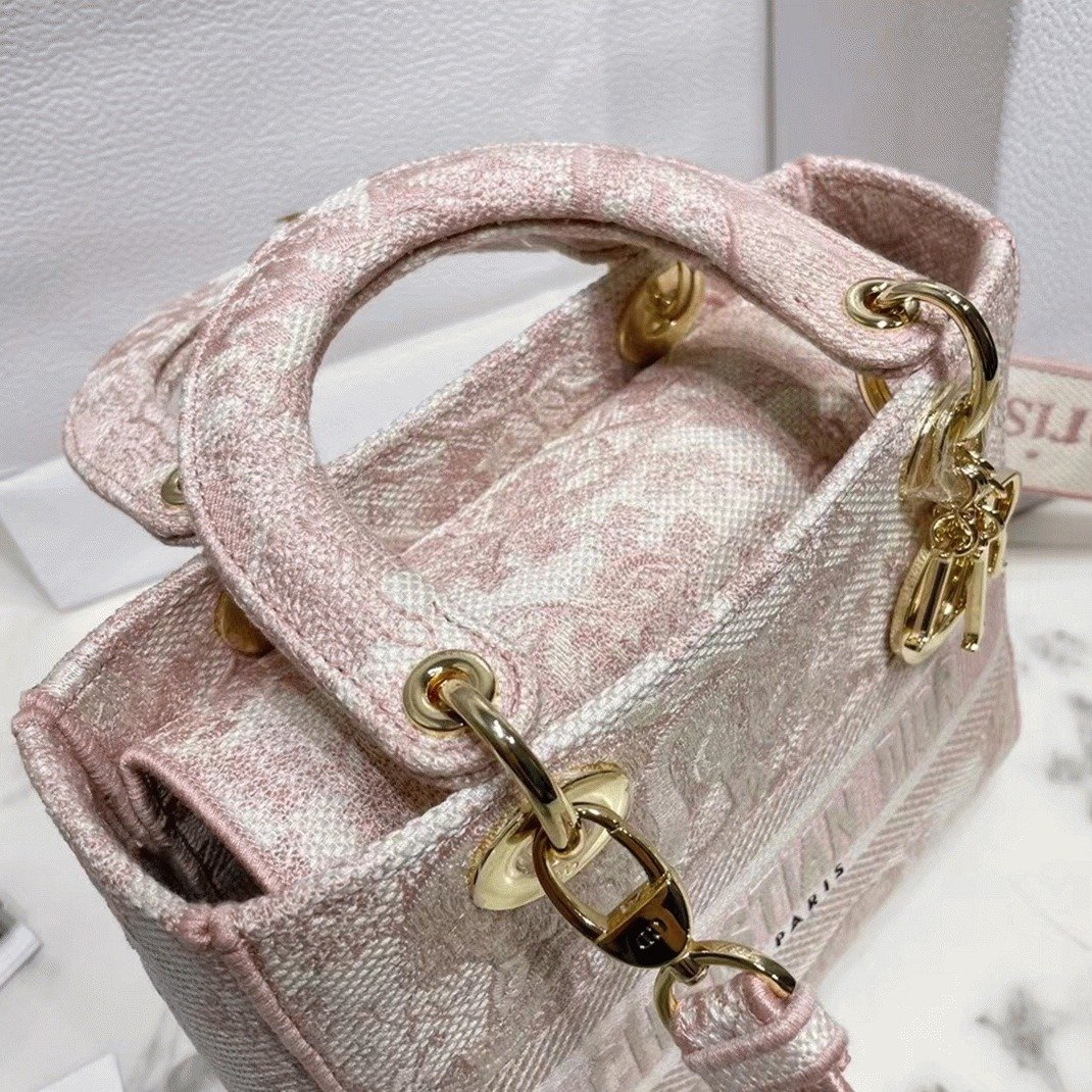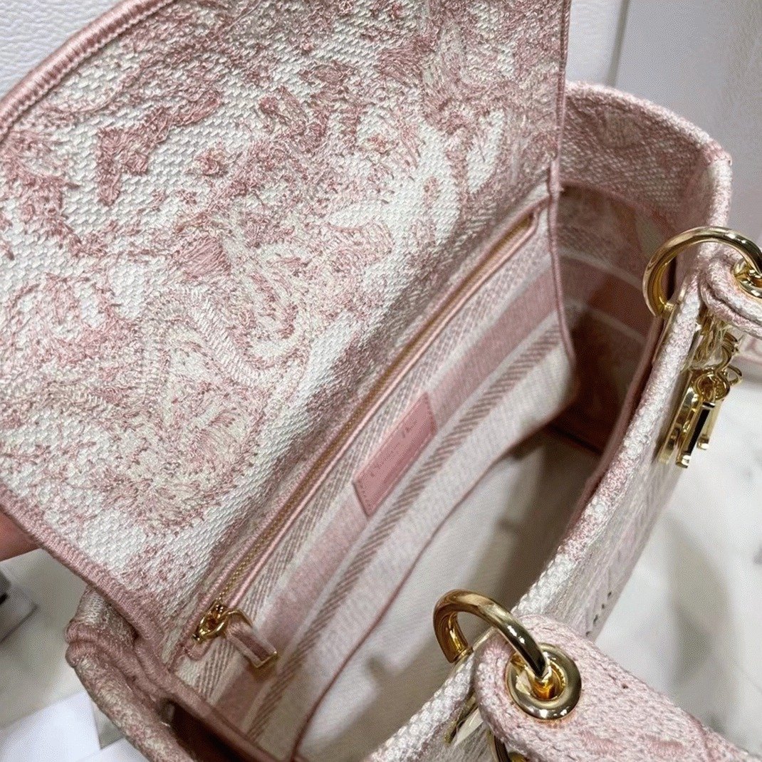 The Lady D-Lite bag perfectly combines classic elegance with contemporary design influences from Dior. This medium-sized bag features intricate embroidery of the Rose des Vents Toile de Jouy motif, lending a refined sophistication. The front proudly showcases the CHRISTIAN DIOR signature, complemented by thick pale gold-finish metal D.I.O.R. charms, adding a luxurious detail.