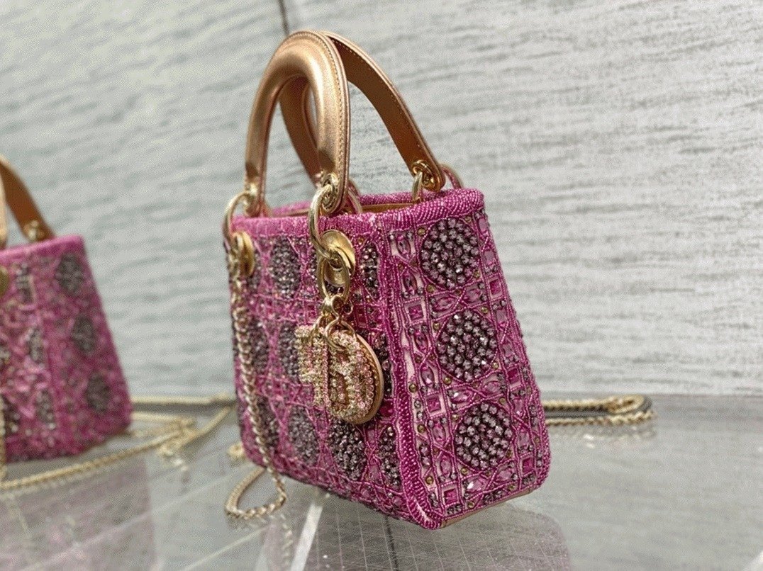 The Lady Dior bag reflects the Houses iconic elegance and craftsmanship. This petite bag is crafted from a blend of calfskin and satin, decorated with delicate resin pearl embroidery and classic Cannage stitching. Accented with pale gold-tone metal ‘D.I.O.R.’ charms, it comes with a detachable chain shoulder strap for carrying by hand or crossbody wear, suited for special occasions.