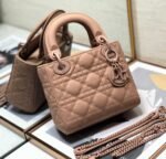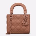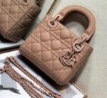 The Lady Dior bag embodies the signature elegance of the House with a refined and timeless silhouette. Made from patent calfskin decorated with the classic Cannage quilting, it features delicate pale gold-finish ‘D.I.O.R.’ charms. This petite version includes a removable chain shoulder strap, allowing it to be carried by hand or worn crossbody, ideal for formal occasions.