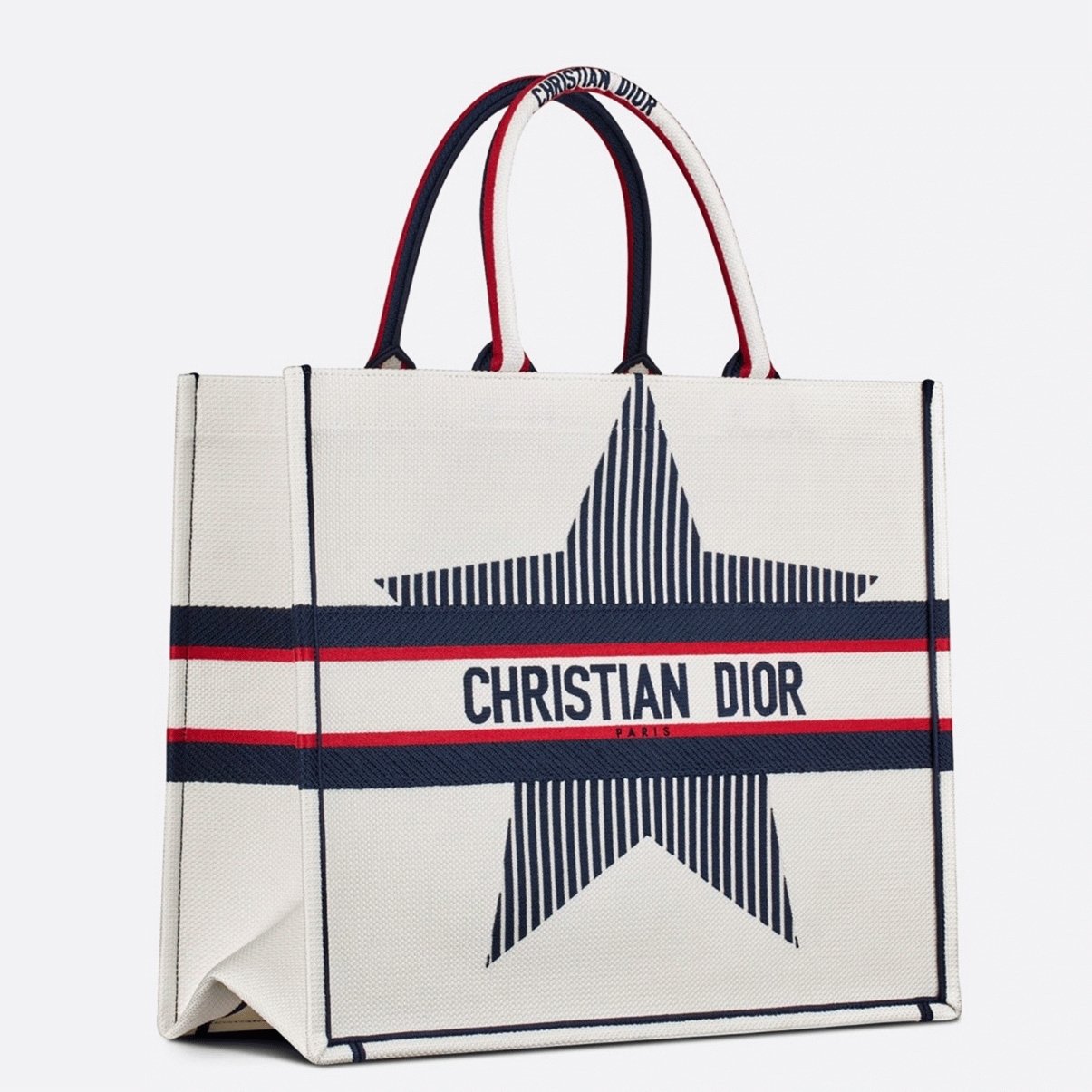 The Dior Book Tote, designed by Diors Creative Director Maria Grazia Chiuri, has become an iconic piece within the Houses collection. This edition, part of the DiorAlps capsule, showcases a fully embroidered blue three-tone pattern featuring Christian Diors lucky star and the prominent CHRISTIAN DIOR signature on the front. Demonstrating the brands exquisite craftsmanship, the tote can be carried by hand or over the shoulder and complements other DiorAlps pieces perfectly.