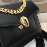 This new addition to Bvlgari’s Serpenti Forever collection offers a crossbody bag with contemporary appeal. Crafted from soft black nappa leather, it features gold-plated brass hardware and a Serpenti head closure. The closure is inspired by a 1960s Bvlgari heritage watch, complete with black onyx scales and red enamel eyes. The Bvlgari chain that drapes across the flap adds a jewelry-inspired element, and it can also serve as a chic handle.