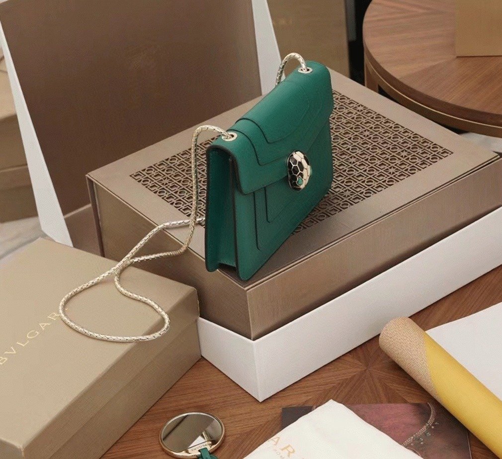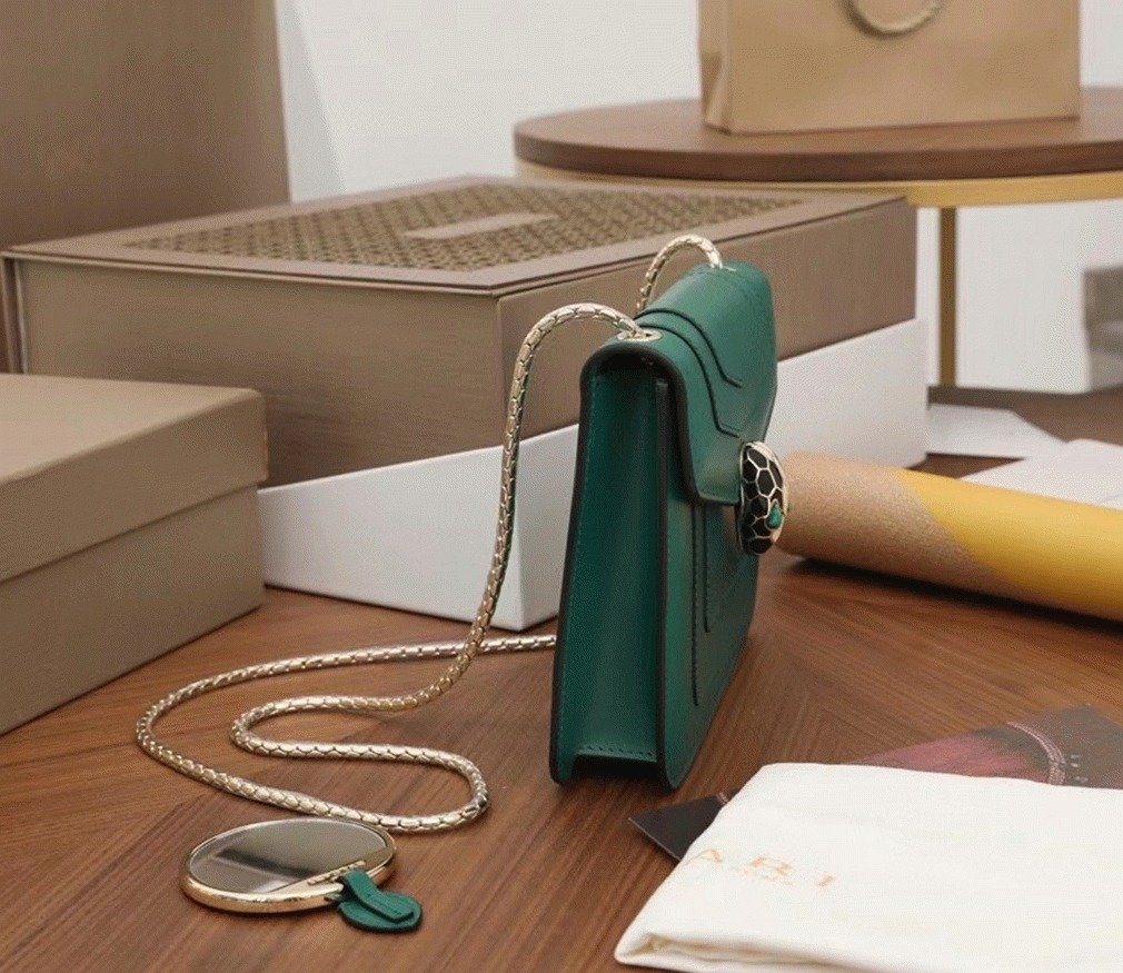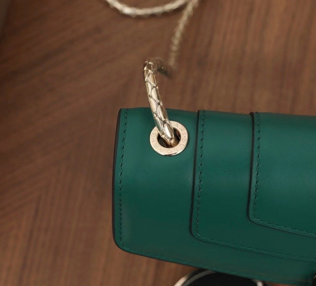 The Serpenti Forever small crossbody bag enhances its timeless allure with premium materials and sophisticated color contrasts. Crafted from smooth calfskin leather, it features the signature Serpenti snakehead clasp, designed in light gold-plated brass and adorned with black and white agate enamel scales, along with striking green malachite eyes. The chain strap, shaped like a snake’s body, adds a distinct touch, drawing inspiration from Bvlgari’s celebrated 1960s Serpenti jewelry collection.