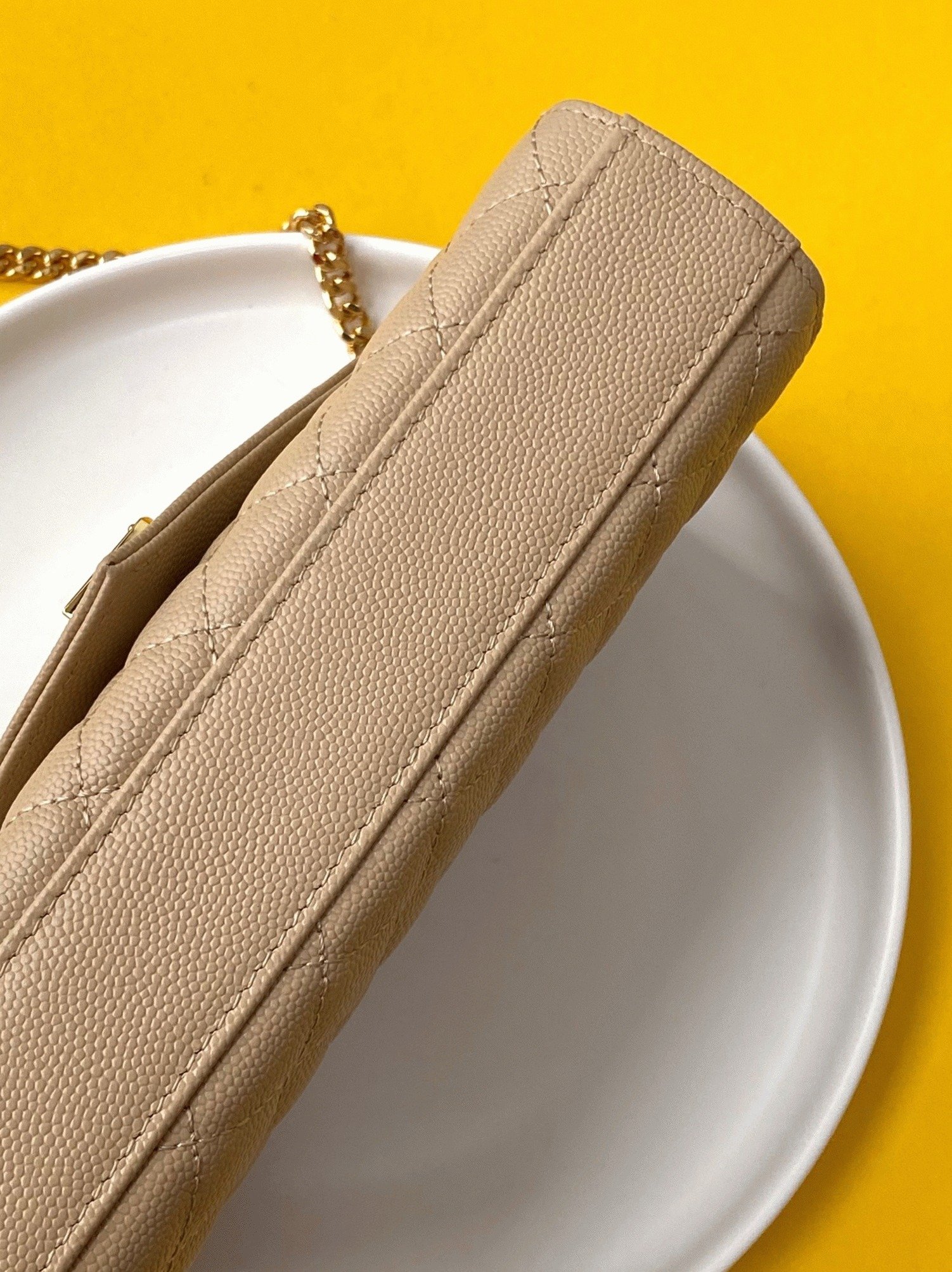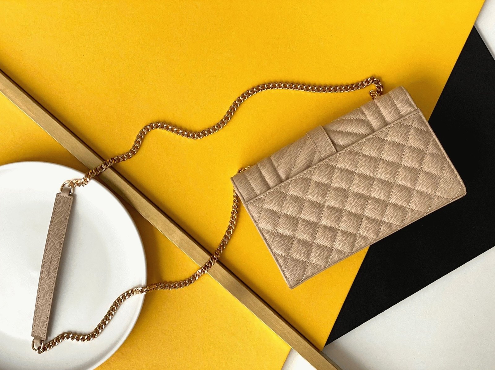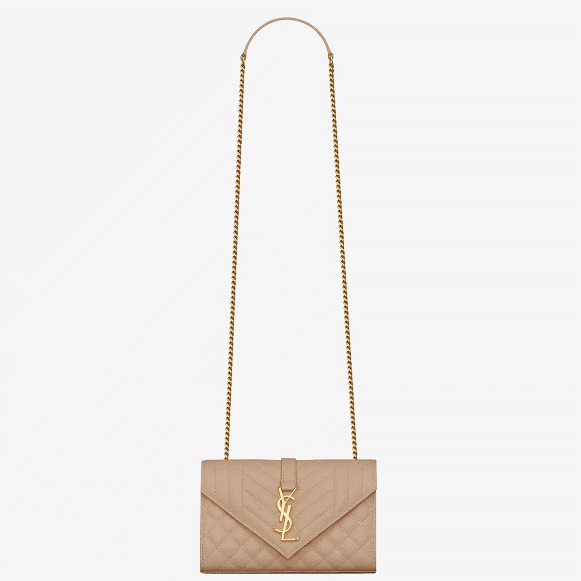 Saint Laurent’s Envelope Bag is a contemporary classic, instantly recognizable with its iconic YSL logo and matelassé stitching. The adjustable chain strap offers flexibility, allowing you to wear it long or short, making it a versatile piece for any occasion.