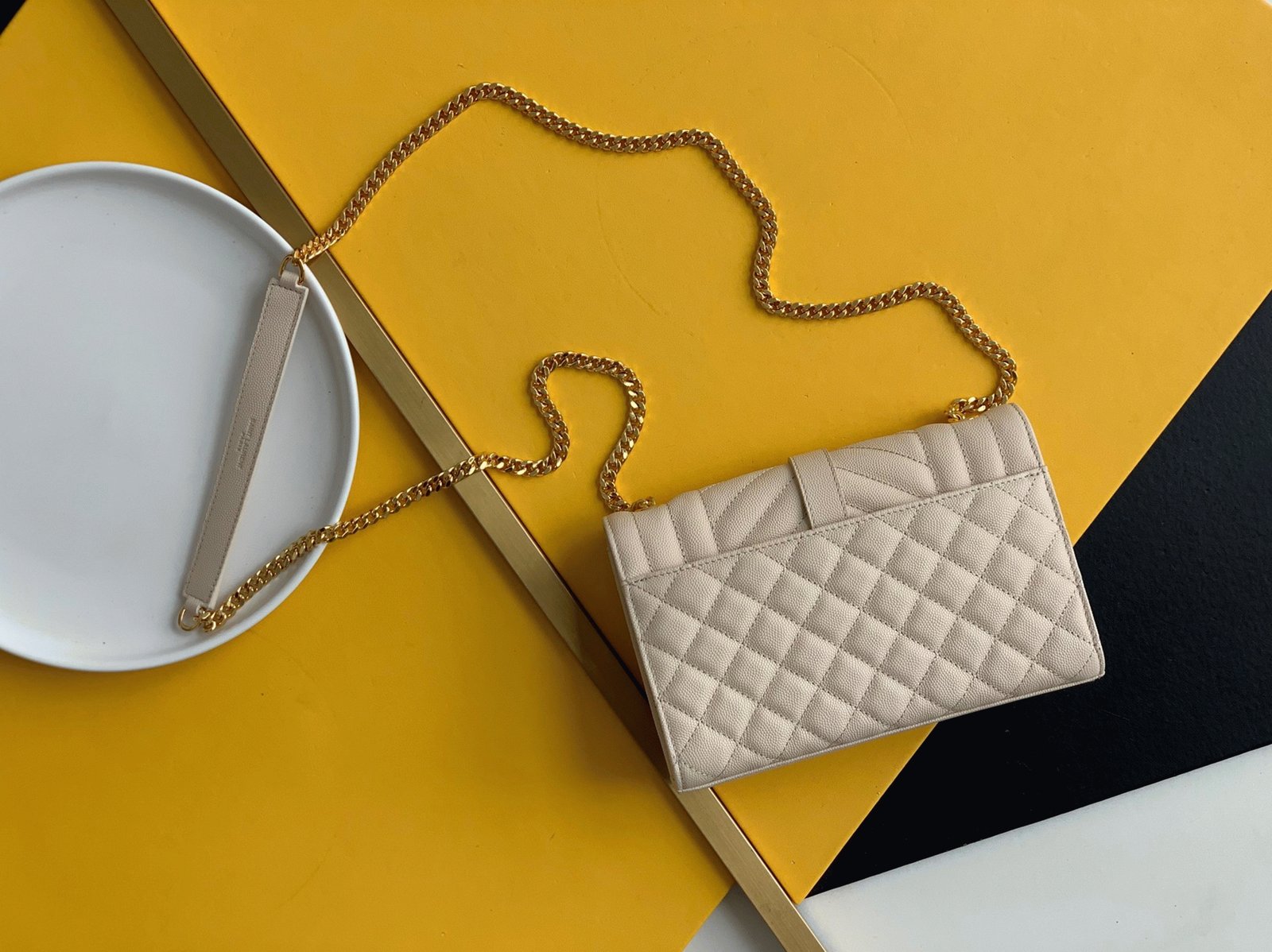 The Envelope Bag by Saint Laurent is a modern classic, instantly recognizable for its iconic YSL logo and distinctive matelassé stitching. The adjustable chain strap allows you to wear it long or short, depending on your daily needs.