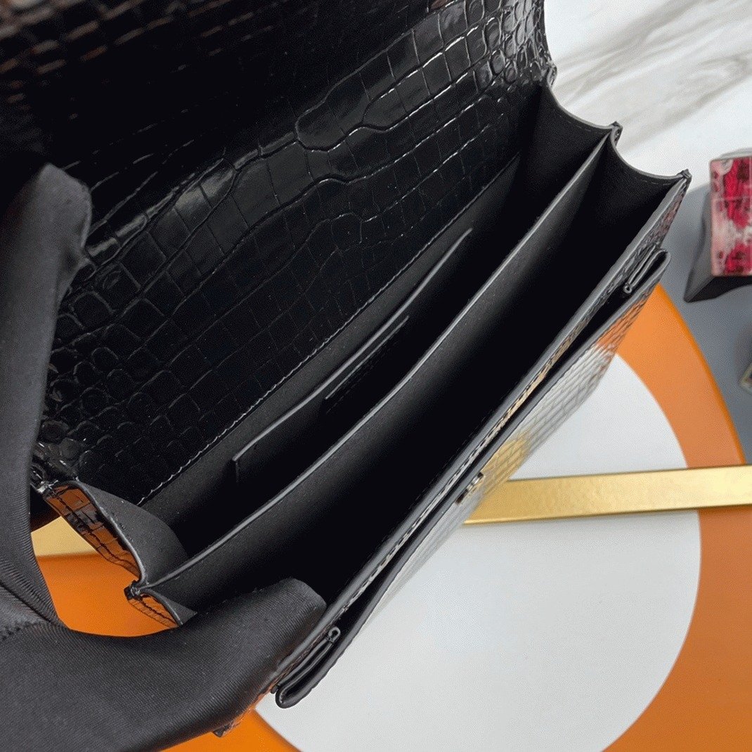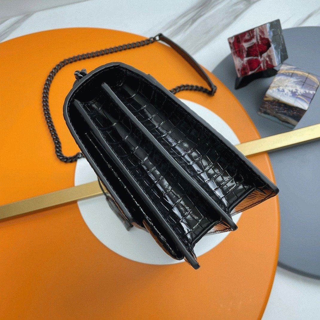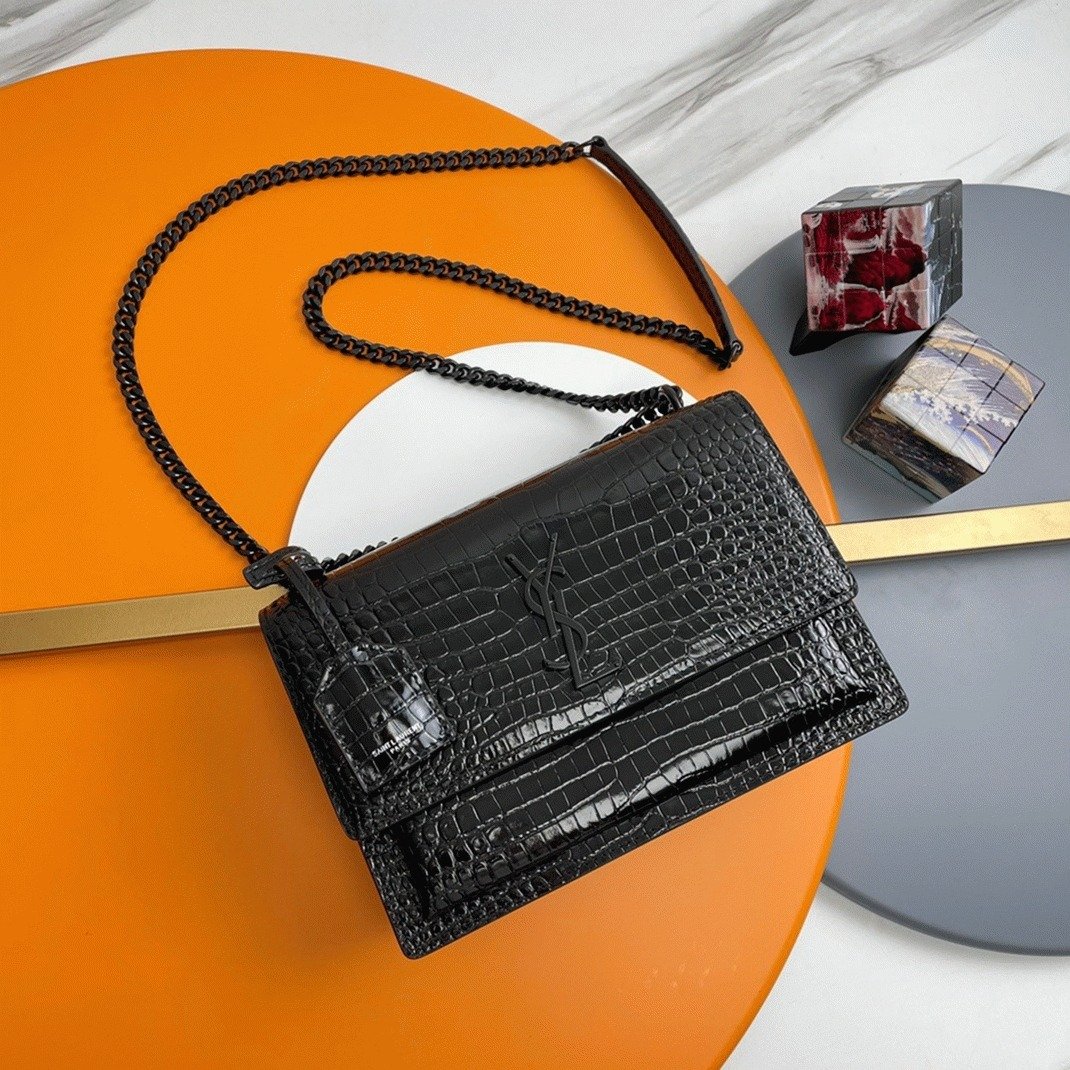 The Saint Laurent Sunset medium bag is a timeless classic, offering a blend of elegance and versatility. Made in Italy from glossy crocodile-embossed calfskin leather, it features the iconic ‘YSL’ logo plaque, a signature from the ’60s. The sleek design is complemented by a stylish chain and leather shoulder strap, adding both sophistication and functionality. The bag’s interior is divided into three compartments, ensuring your essentials are organized and easy to access.