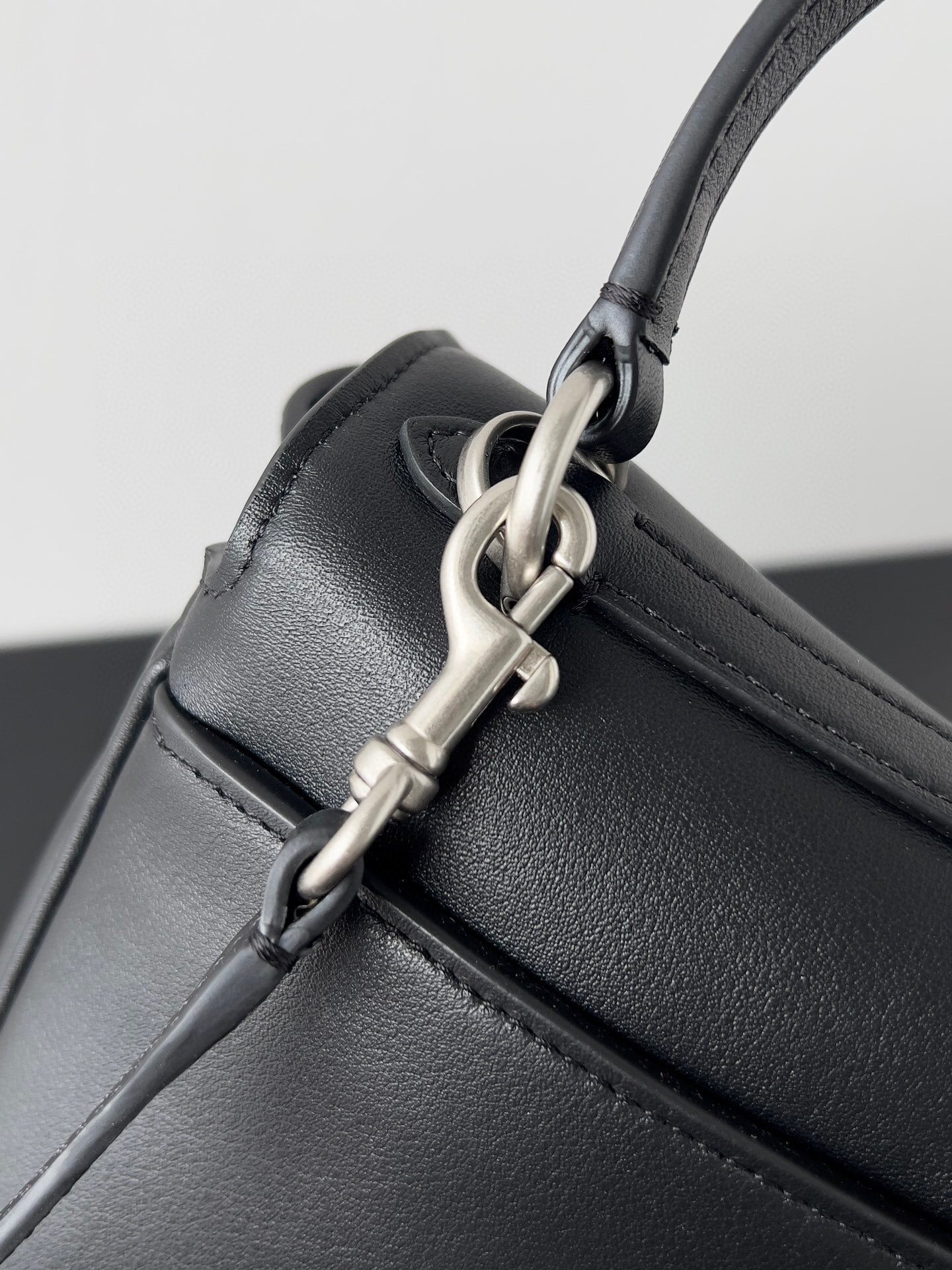 Aged-silver hardware with side snaps