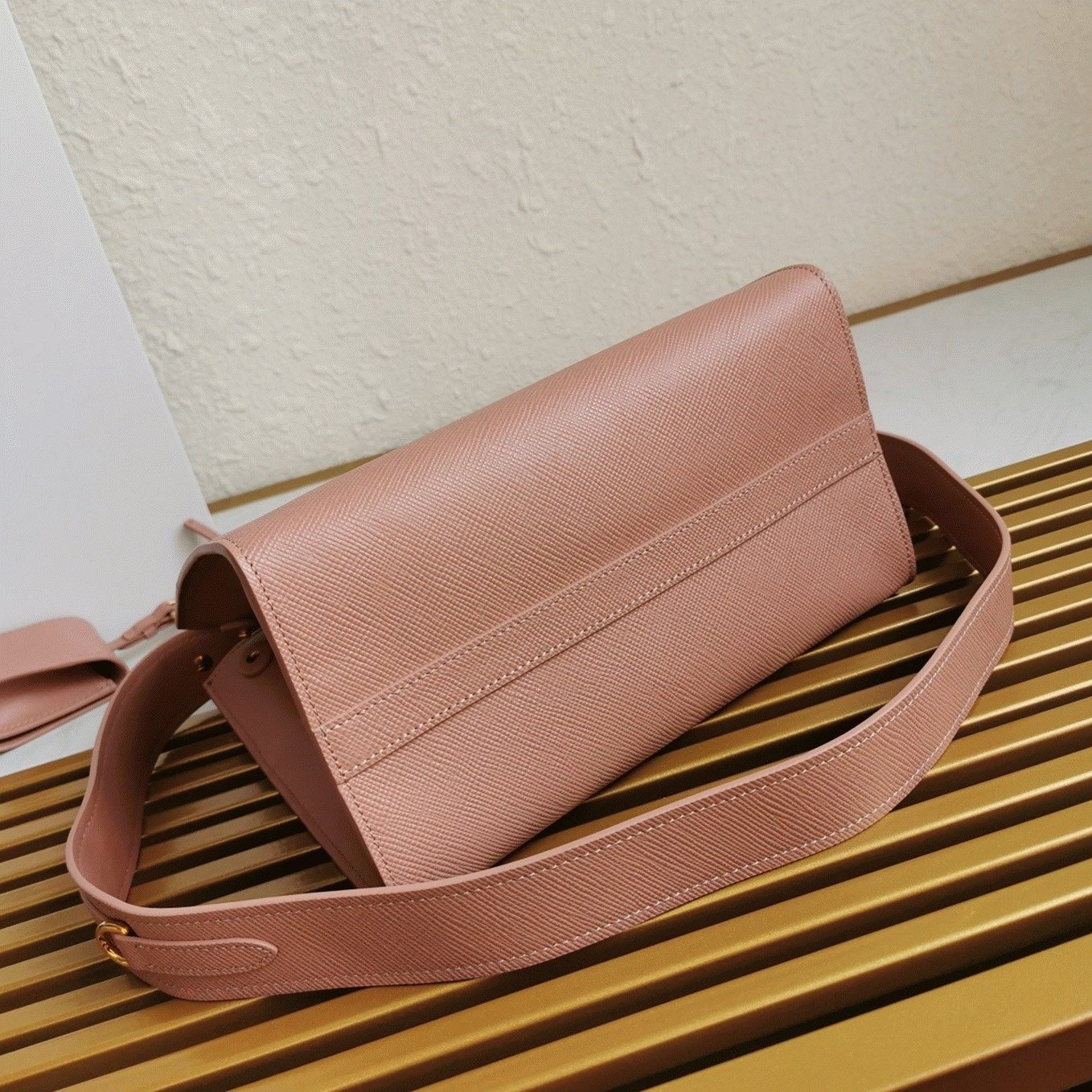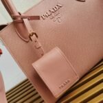 Crafted from signature Saffiano leather, the Prada Monochrome is sleek and refined with a uniform tone and metal logo. Known for its crosshatch texture and waxed finish, this leather symbolizes classic Italian craftsmanship.