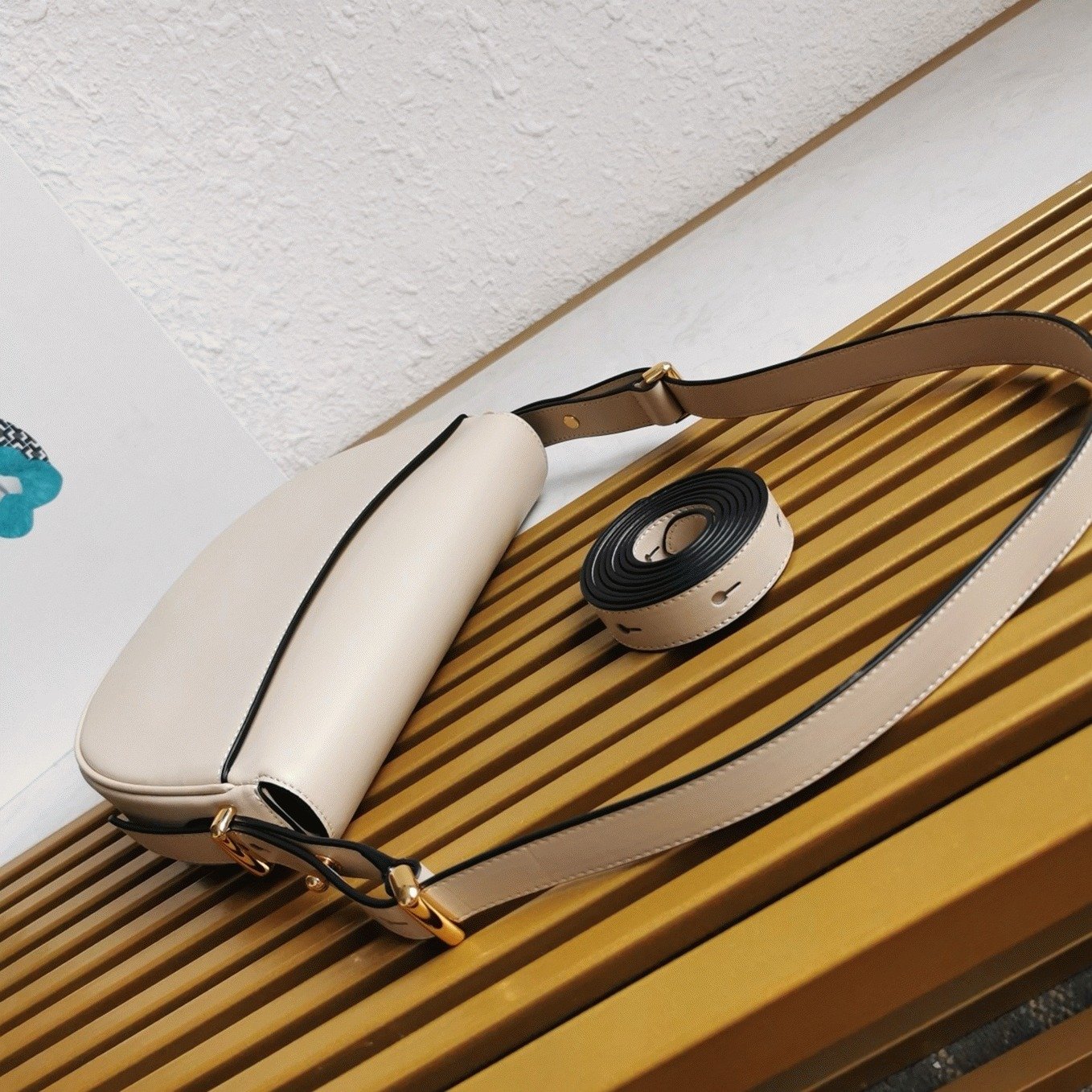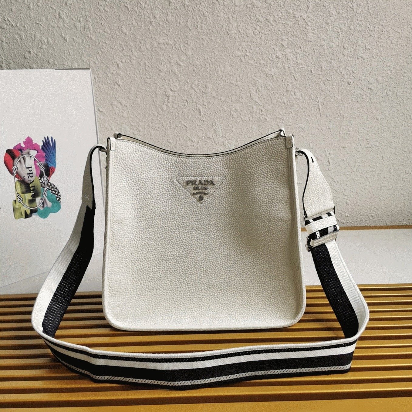 This Prada hobo bag embodies the brands refined aesthetic, combining modern style with elegant design. The front is decorated with a metal lettering logo, and the two-tone embroidered shoulder strap complements the logo while offering a textured, sporty finish.