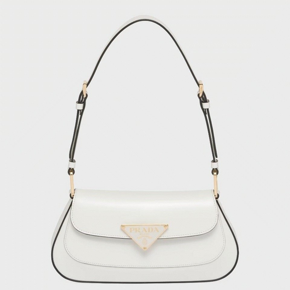 Combining modern style with timeless elegance, this Prada shoulder bag features smooth, curved lines and brushed leather that lends it versatility. The flap is detailed with an enameled metal triangle logo on the clasp, complementing the sleek silhouette. It can be worn as a handbag or shoulder bag with the leather handles extension.