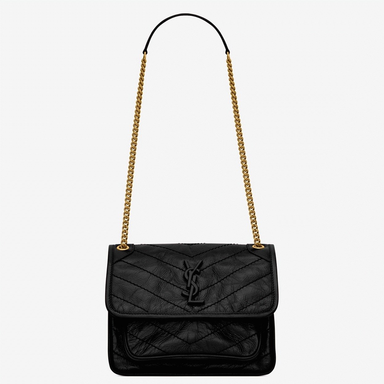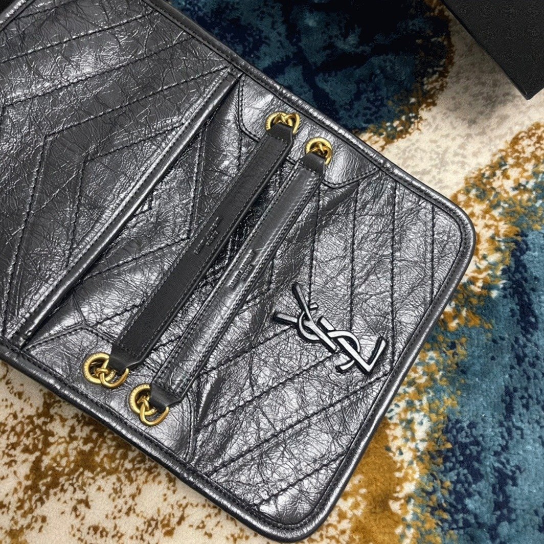 The Niki Baby Chain Bag from Saint Laurent is designed with intentional crinkling and texture to give it a vintage-inspired look. Made from crinkled calfskin, it features an adjustable sliding strap and a logo plaque at the top. The compact interior is well-organized, providing space for your essentials such as a compact, cardholder, and phone.