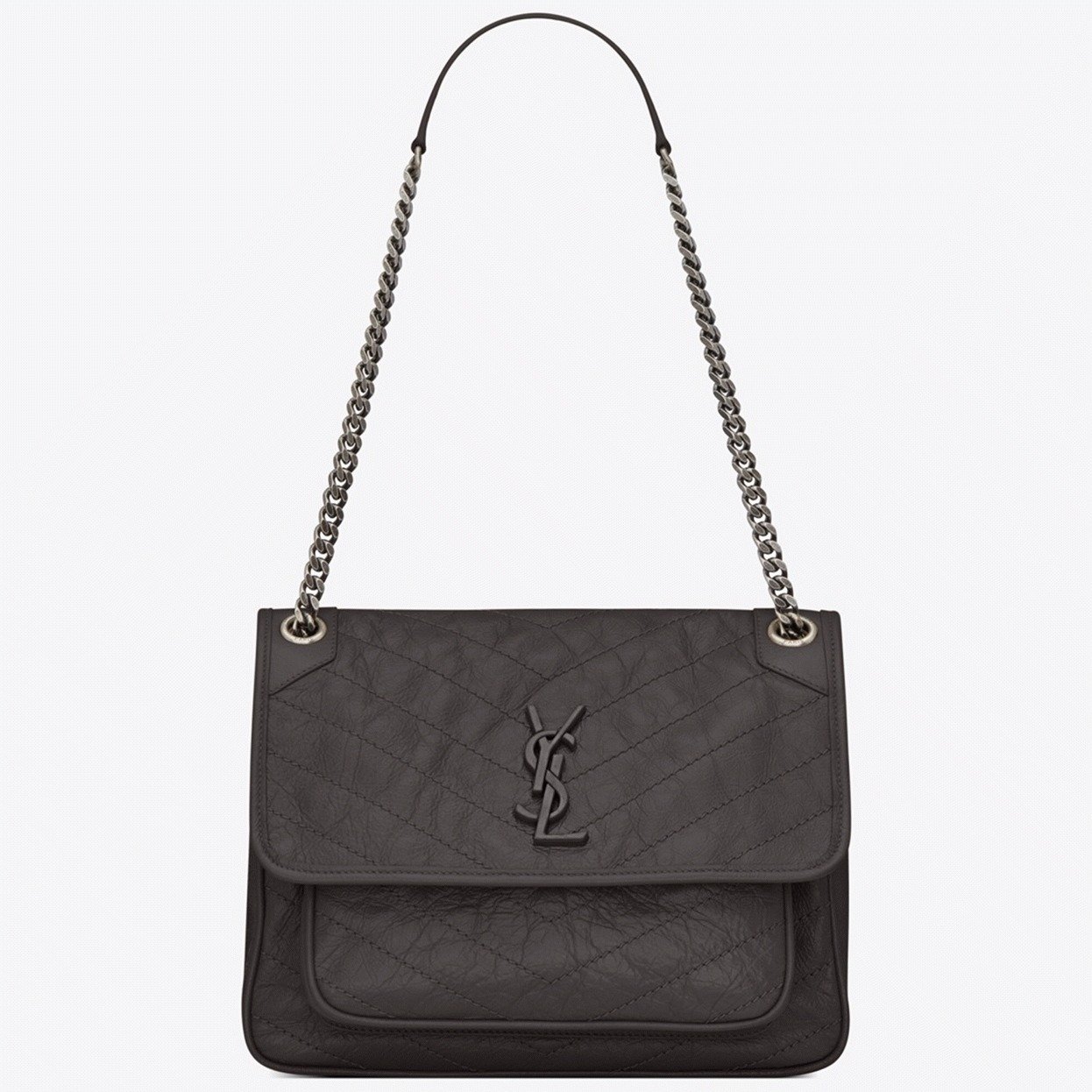 The Niki Baby Chain Bag from Saint Laurent is designed to look vintage, with intentional crinkling and texture. Made of crinkled calfskin, it features an adjustable sliding strap and a logo plaque at the top. Its compact interior has enough space for your essentials, including a compact, cardholder, and mobile phone.