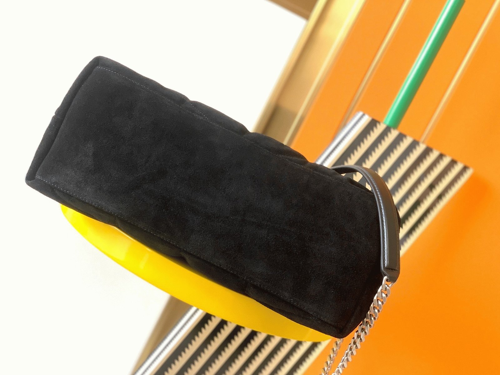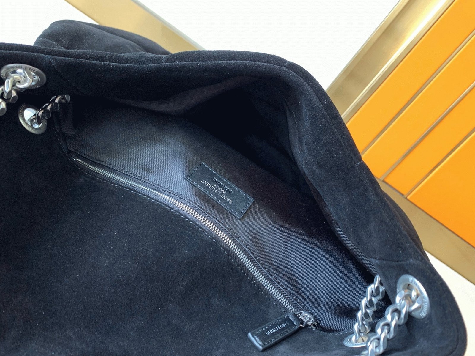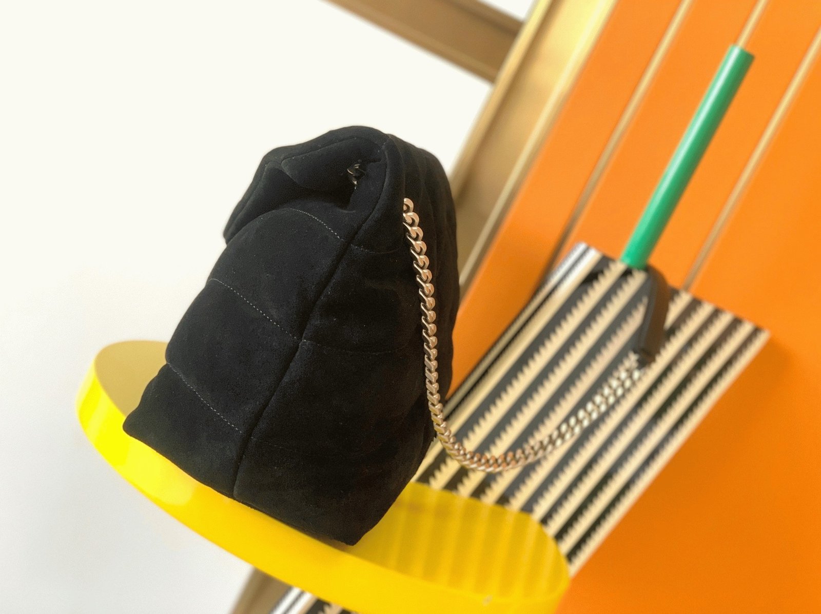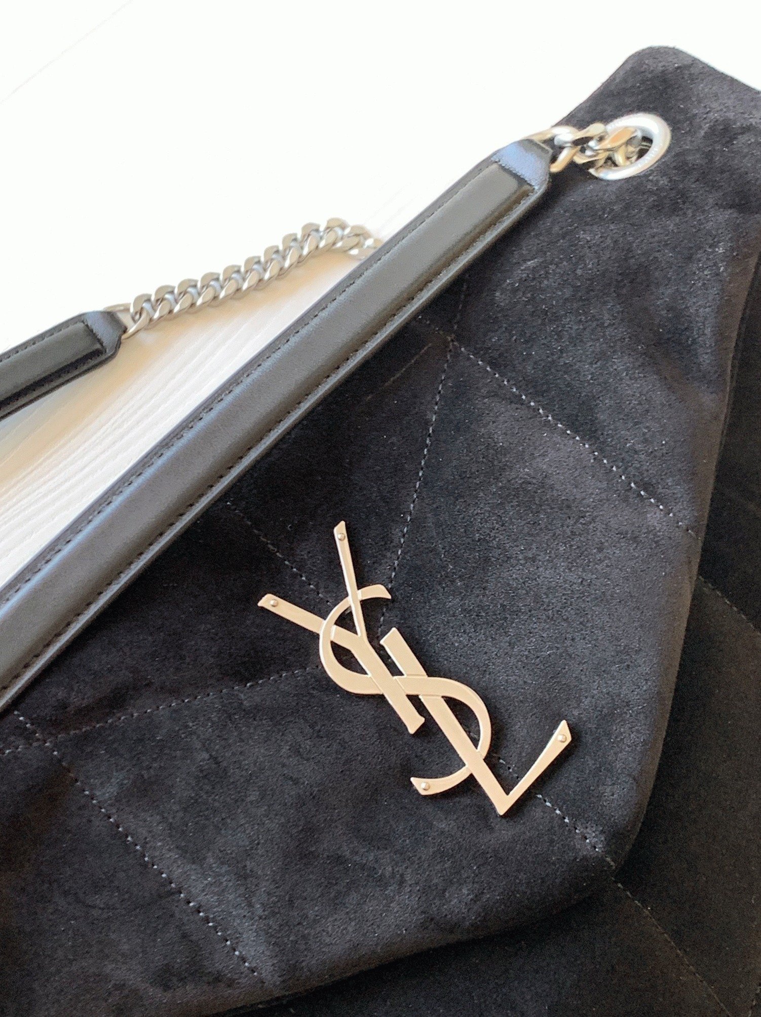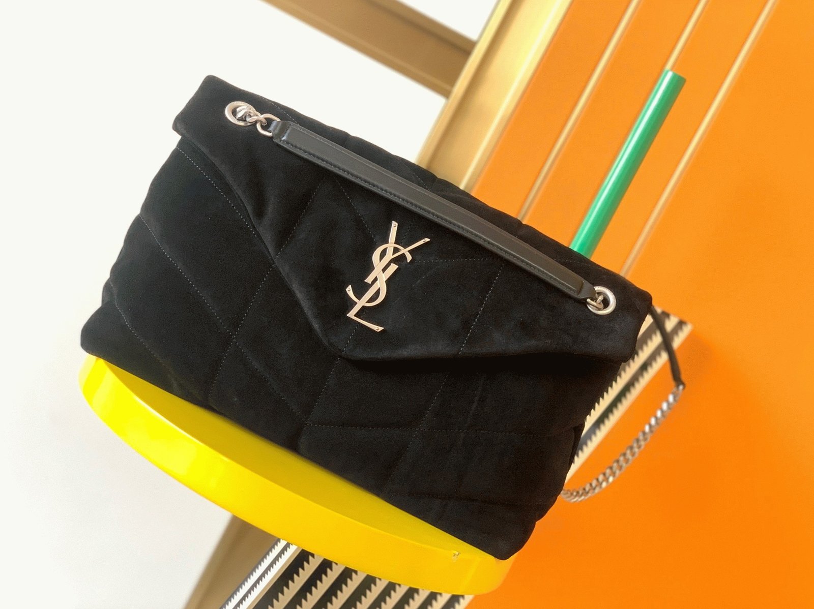 The Saint Laurent Puffer bag honors Loulou de la Falaise, an iconic muse and close friend of Yves Saint Laurent. This luxurious piece is crafted from soft suede calfskin and features the signature YSL plaque at the front. Its versatility is highlighted by a sliding chain strap, allowing you to wear it doubled up as a shoulder bag or extended for a longer fit. Inside, the bag offers ample space, with a zippered pocket for organizing daily essentials like a water bottle, phone, and tablet.