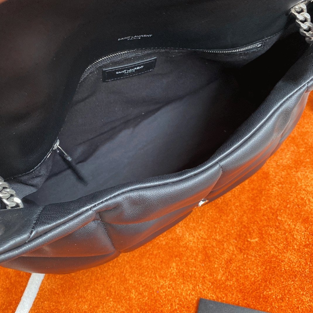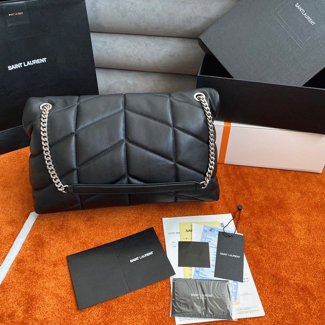 The Saint Laurent Puffer bag is a tribute to Loulou de la Falaise, a muse and friend of Yves Saint Laurent, known for its classic design. Crafted from quilted lambskin and adorned with the iconic YSL plaque, this bag combines elegance with everyday practicality. It features a sliding chain strap that can be worn either doubled for a shoulder-length fit or extended for a longer crossbody style. Spacious enough for all your essentials, such as a water bottle, phone, and tablet, it brings both convenience and style.