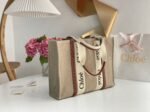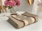 The ‘Woody Tote,’ featured on the Chloe runway, was a top pick among our buyers due to its stylish and adaptable design. Constructed from linen-canvas, it boasts a roomy rectangular silhouette with leather trims accented by logo-printed webbing. The long top handles are designed to be comfortably worn over the shoulder. This bag offers enough space for your everyday essentials along with an extra pair of flats.
