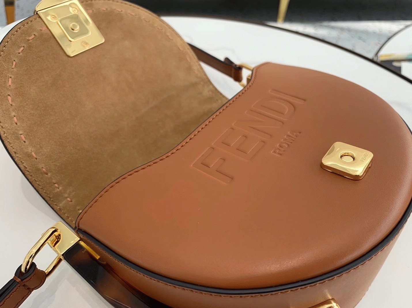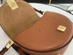 It includes a metal closure adorned with the iconic FF motif, with “Fendi Roma” hot-stamped beneath the flap. Additional features include tortoiseshell-effect plexiglass details, gold-tone hardware, and a single flat interior pocket.
