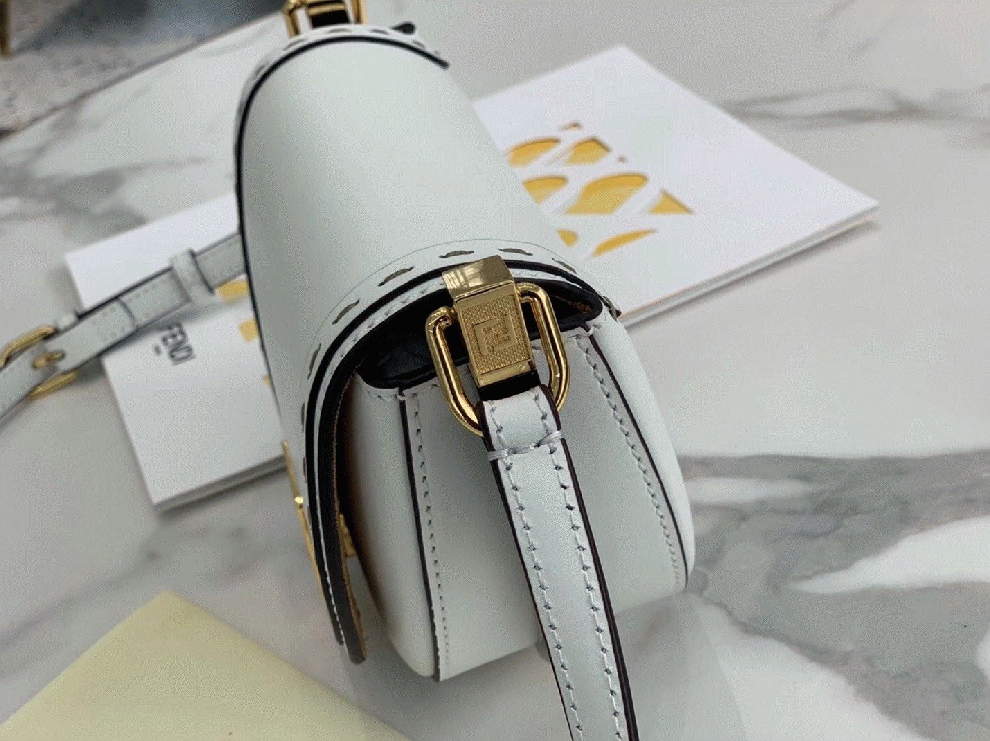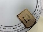 It includes a metal closure adorned with the iconic FF motif, with “Fendi Roma” hot-stamped beneath the flap. Additional features include tortoiseshell-effect plexiglass details, gold-tone hardware, and a single flat interior pocket.