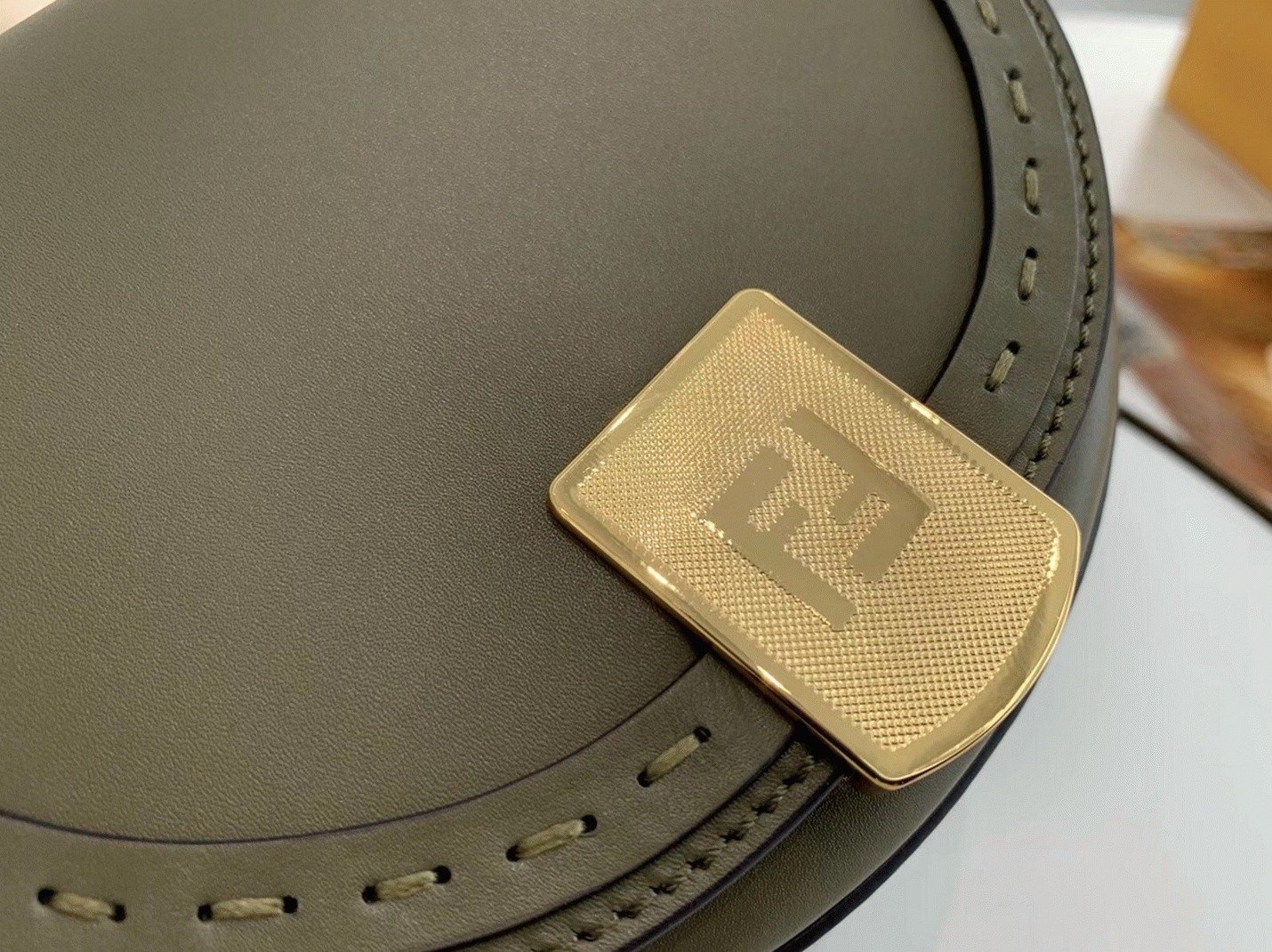 It includes a metal closure adorned with the iconic FF motif, with “Fendi Roma” hot-stamped beneath the flap. Additional features include tortoiseshell-effect plexiglass details, gold-tone hardware, and a single flat interior pocket.
