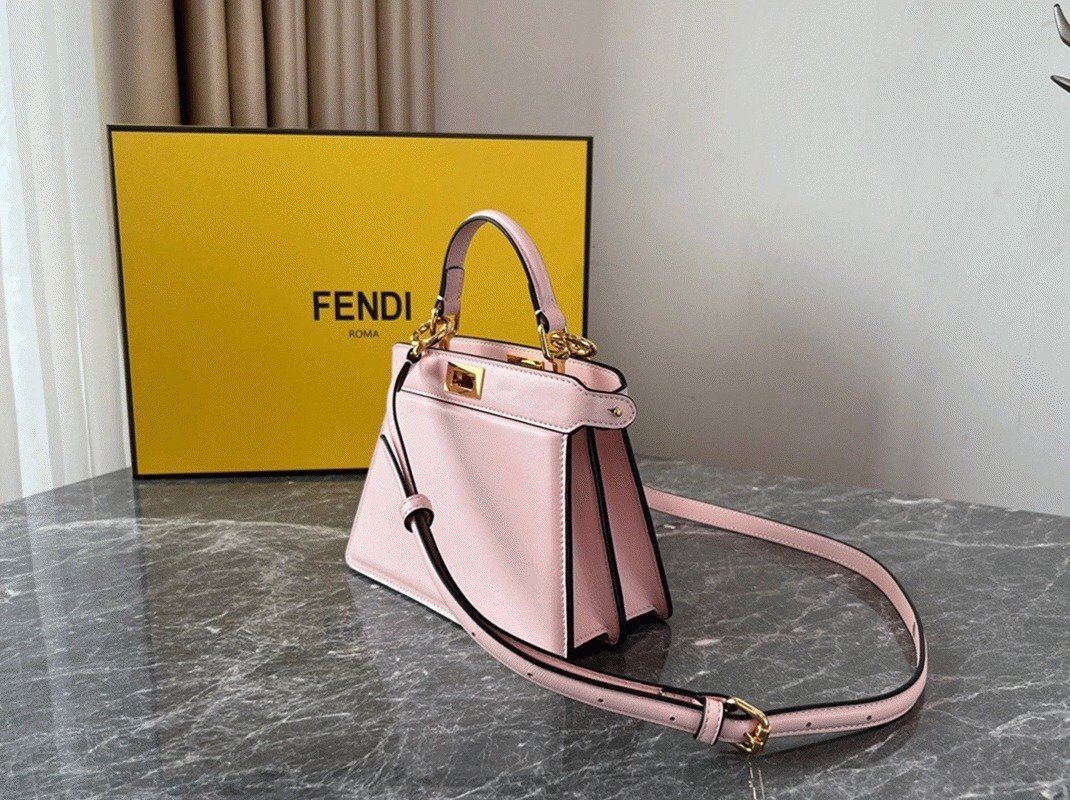 Fendi Peekaboo Petite is a smaller version that retains the playful and beautiful design of the original. This version upholds the Peekaboo’s cool attitude and clean, minimal lines. The strap can be removed or replaced to customize the look. Designed for crossbody wear but also suitable for shoulder carrying. Made from 100% lambskin, it features classic twist locks on both sides.