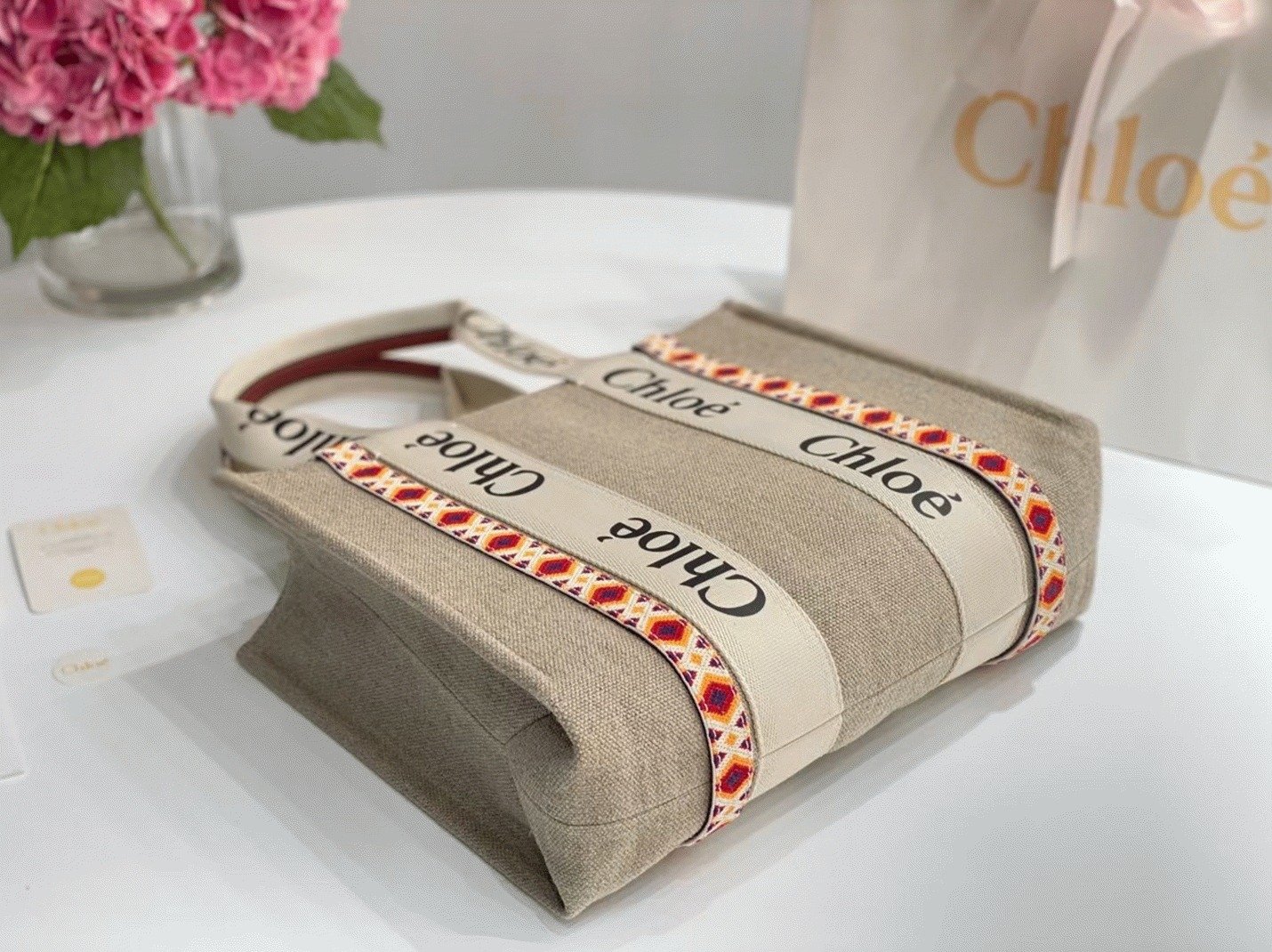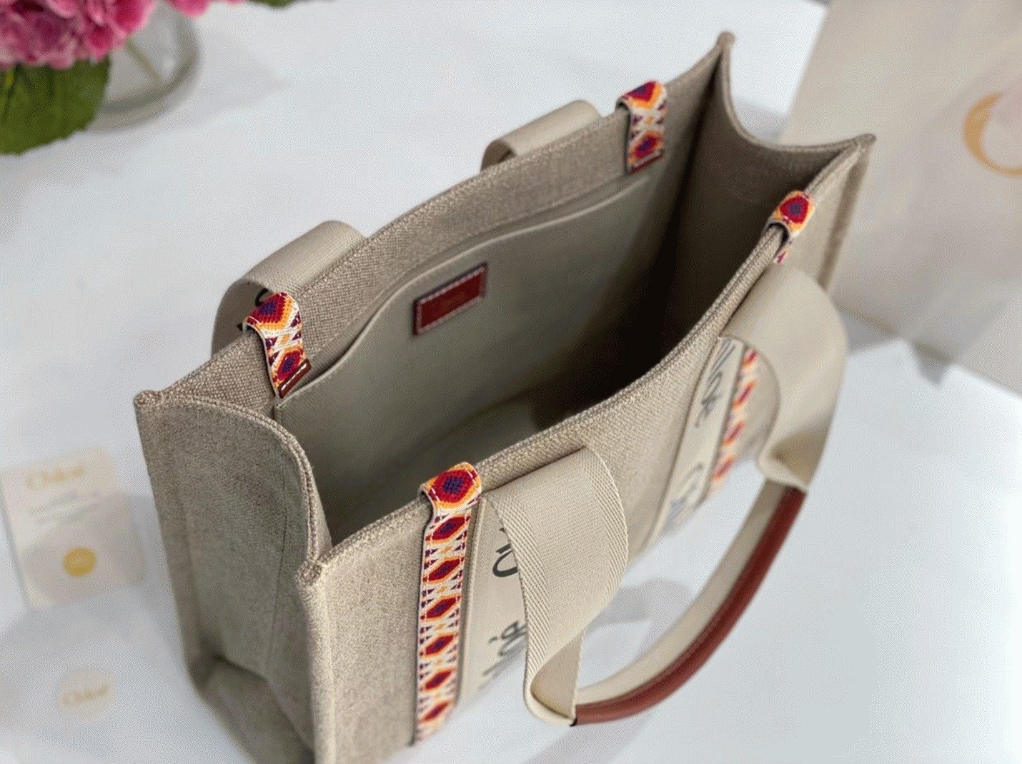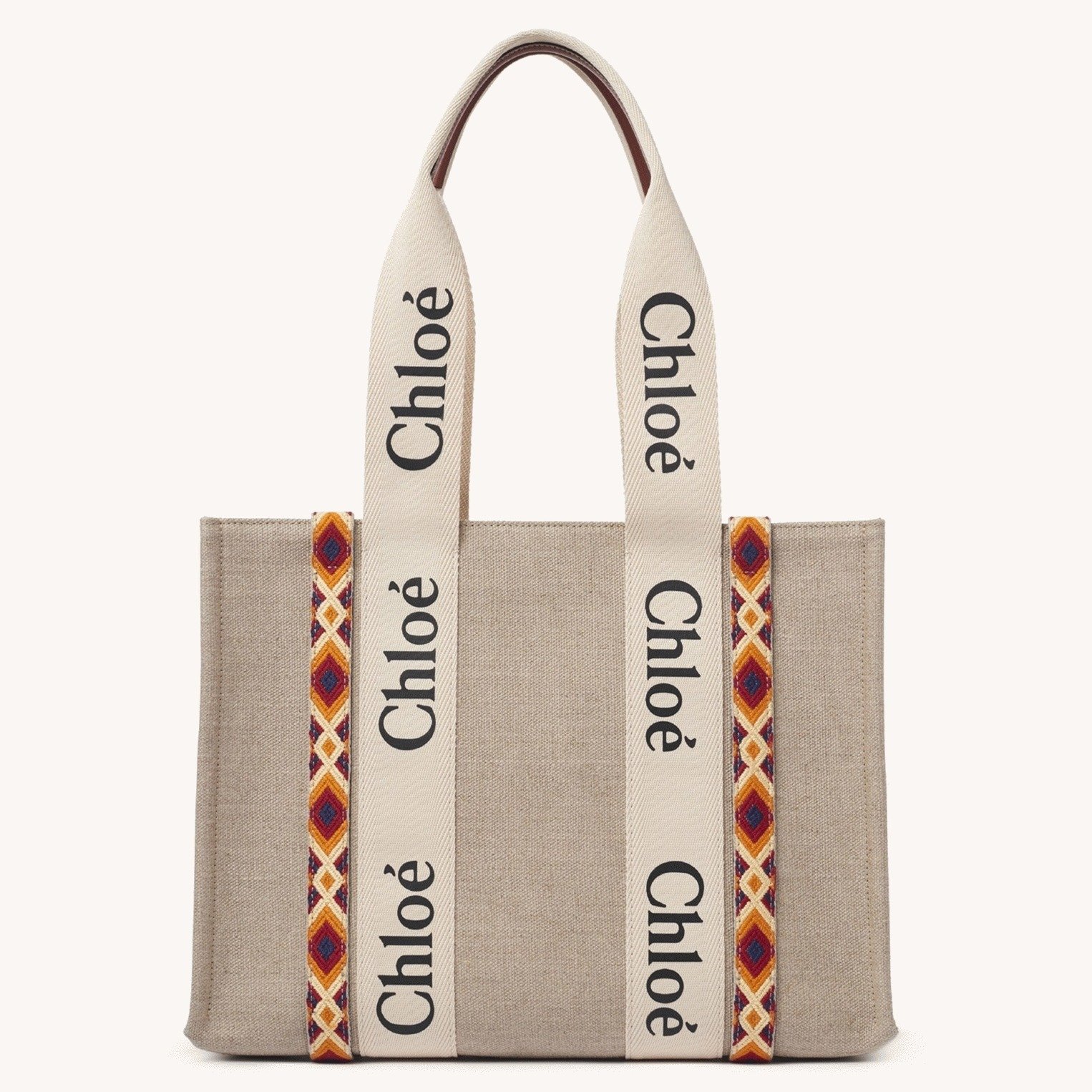 Top Quality Faux Chloe Medium Woody Tote Bag in Canvas with Brown Leather Strips