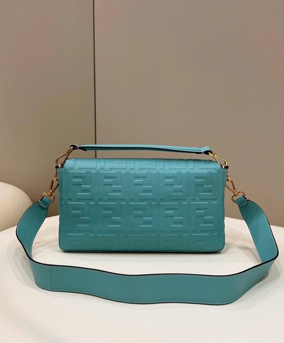 Fendi’s large Baguette Bag is crafted in nappa leather featuring an all-over FF motif. It offers an adjustable handle and a leather shoulder strap for versatile carrying options. The flap closes with a magnetic FF clasp and is accented with gold-finish hardware. Inside, the bag is lined with textile and has a zipped pocket for organization.