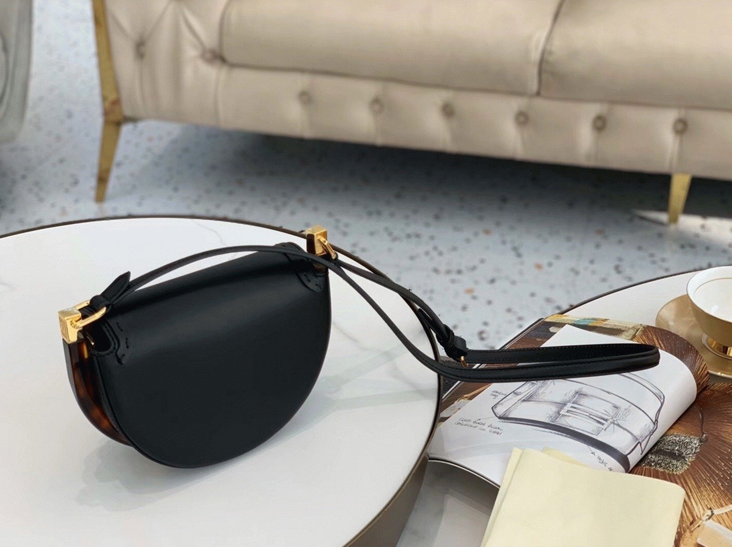 The Moonlight bag takes its name from its crescent shape, which also pays homage to the Lunar Year collection introduced last January, a design cherished by the Maison. This versatile bag can be worn as a crossbody or handbag and incorporates all the signature elements of the Sunshine Shopper in a circular silhouette, highlighted by rigid tortoiseshell accents on the sides. The adjustable shoulder strap features a bold, feminine style with contrasting colors, allowing you to wear it comfortably on the shoulder or across the body.