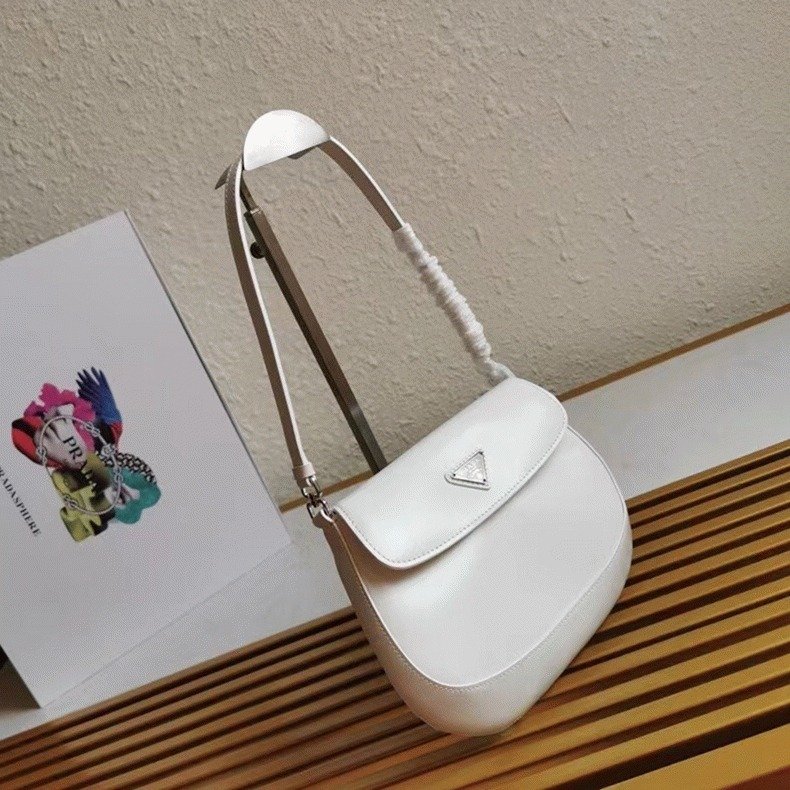 The Prada Cleo bag radiates refined elegance, revisiting a classic 1990s design with a fresh perspective. Its smooth, curved silhouette, characterized by rounded edges and a rounded base, gives the flap bag a light and graceful look. Made from brushed leathera contemporary and adaptable material closely associated with Pradathis piece invites countless styling opportunities through its blend of textures and contrasts. The iconic enamel triangle logo on the flap adds a distinguished and elegant finishing detail.